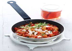 Ψωμωμένες πιπεριές Φλωρίνης και ζουμερά ντοματίνια σε ένα καλοκαιρινό καγιανά για 2, έτοιμο σε 15 λεπτά!
