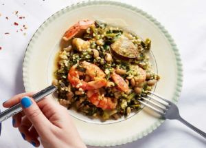 Πλούσιο πιάτο, χορταστικό και με ωραίους συνδυασμούς υλικών και υφών. Αν θέλετε, μαζί με τις γαρίδες μπορείτε να προσθέσετε στο τηγάνι και μερικά όστρακα – κυδώνια, αχηβάδες ή γυαλιστερές.