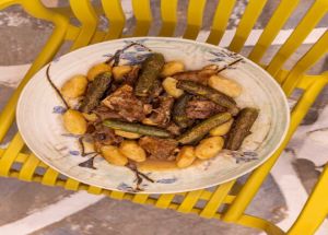 Στο σπίτι της κ. Φραντζέσκας Χανιώτη ακόμα ζει και βασιλεύει η νοστιμιά της παλιάς Μυκόνου. Στην κουζίνα της μας μαγείρεψε τα πιο τρυφερά κολοκυθάκια με κατσίκι στην κατσαρόλα.