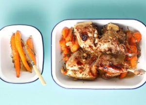 - Σε ένα μπολ ανακατεύουμε τα καρότα και το υπόλοιπο σκόρδο, το υπόλοιπο θυμάρι και αλατοπίπερο, και τα σκορπίζουμε γύρω από το κατσίκι.