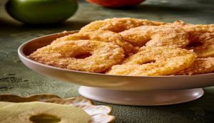 - Βουτάμε τις φέτες μήλου στον χυλό, αφήνουμε να στάξει η περίσσεια και τις τηγανίζουμε σε δόσεις για 6-8 λεπτά ή μέχρι να γίνουν τραγανές και χρυσαφένιες, γυρίζοντάς τες τακτικά μέσα στο λάδι.