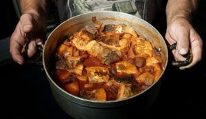 Μας ετοιμάζει παστό μπακαλιάρο πλακί με πατάτες και θυμάται: «Προσευχή κάναμε πριν από τα γεύματα. Και δύο φορές, ευτυχώς μονάχα δύο φορές, χρειάστηκε να προσευχηθούμε σε όλους τους Αγίους…»