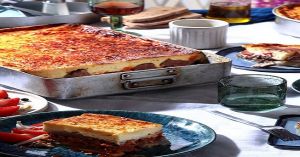 Έχει μελιτζάνες και πατάτες και πλούσια μπεσαμέλ, αντί για κιμά όμως έχει μοσχαράκι κρασάτο αυτός ο μουσακάς. Και είναι πραγματικά πεντανόστιμος.