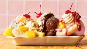 - 3 μεγάλες μπάλες παγωτό διαφορετικών γεύσεων, π.χ. σοκολάτα, βανίλια, φράουλα 1 μεγάλη ώριμη μπανάνα, κομμένη κατά μήκος στη μέση
