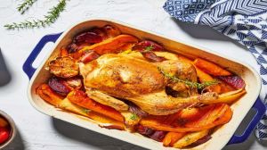 - Φουρνίζουμε και ψήνουμε για περίπου 1 ώρα. Για το σωστό ψήσιμο του κοτόπουλου, καλό είναι να το θερμομετρήσουμε με θερμόμετρο μαγειρικής που θα μπήξουμε στο πιο παχύ σημείο ενός από τα μπούτια του, χωρίς να ακουμπήσει το κόκαλο. Θα πρέπει να δείξει 65°C, σημάδι ότι έχει ψηθεί μέχρι μέσα και ταυτόχρονα είναι ζουμερό και τρυφερό.