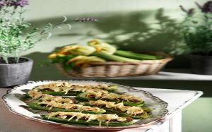 Τα κολοκυθάκια είναι το κατεξοχήν υλικό για συνταγές barquette. Σε αυτήν τη συνταγή, ο σεφ γεμίζει τις «βαρκούλες» με μελωμένο ραγού μοσχαριού.