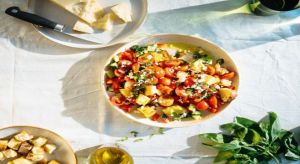 - Περιχύνουμε με τη βινεγκρέτ, ανακατεύουμε και αφήνουμε τη σαλάτα κατά μέρος για 30 λεπτά, για να απορροφήσει το ψωμί τα νόστιμα ζουμιά των υλικών.