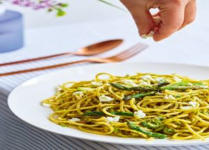 - Όταν είναι έτοιμα τα ζυμαρικά, τα βγάζουμε από το νερό τους με μια πιρούνα (έτσι παίρνουμε μαζί και λίγο από το νερό τους, χρήσιμο για να ολοκληρώσουμε το μαγείρεμά τους), τα ρίχνουμε στα σπαράγγια και μαγειρεύουμε για 2 λεπτά, ανακατεύοντας.