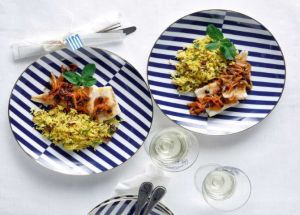 Ξεφεύγουμε από τον παραδοσιακό μπακαλιάρο σκορδαλιά και φτιάχνουμε ένα πιάτο φίνο και ιδιαίτερο που συνοδεύουμε με ρύζι μπασμάτι με κουρκουμά, κουκουνάρι και δυόσμο.