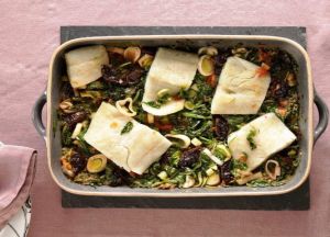 - Σκορπίζουμε τις σταφίδες ή τα δαμάσκηνα (αν βάλουμε) και ψήνουμε για περίπου 1 ώρα ή μέχρι να ψηθεί και να ροδίσει ο μπακαλιάρος.