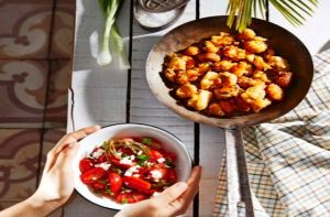Ιδανικό συνοδευτικό για τα τραγανά αυτά μύδια είναι μια ωραία σαλάτα που θα φτιάξουμε ανακατεύοντας σε ένα μπολ 250 γρ. ντοματίνια κομμένα στη μέση, 1 φρέσκο κρεμμυδάκι ψιλοκομμένο, 1 κουτ. σούπας κρίταμο τουρσί, ξεπλυμένο και στραγγισμένο, 60 ml ελαιόλαδο, αλάτι και πιπέρι. Στο σερβίρισμα θρυμματίζουμε πάνω από τη σαλάτα 150 γρ. νωπή μυζήθρα ή ανθότυρο.