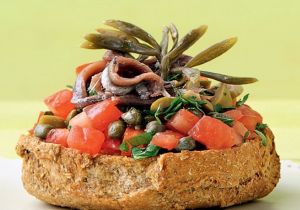 Ντάκος με ντομάτες και κρίταμο και αντζούγιες που προσθέτουν έξτρα νοστιμιά και δένουν τέλεια με τα υπόλοιπα υλικά.