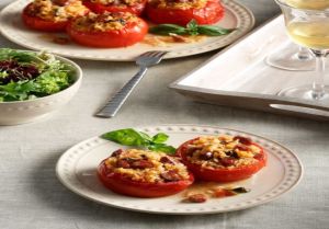 - Με ένα κουτάλι γεμίζουμε με το μείγμα τις ντομάτες κατά τα 2/3 (για να αφήσουμε χώρο στο ρύζι να φουσκώσει), τις περιχύνουμε με το υπόλοιπο ελαιόλαδο και κλείνουμε με τα «καπάκια».
