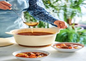 - Τότε προσθέτουμε τα καρότα και τις πατάτες και συνεχίζουμε το μαγείρεμα για άλλα 30-35 λεπτά, μέχρι το κρέας να είναι πλέον πολύ τρυφερό και να έχουν μαλακώσει τα λαχανικά. Αν ο ζωμός έχει μειωθεί αρκετά, ρίχνουμε καυτό νερό – το φαγητό πρέπει να είναι σούπα, όχι απλώς σαλτσάτο.