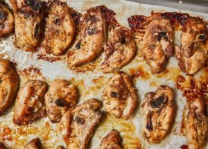 - Προθερμαίνουμε τον φούρνο στους 180-200°C στη λειτουργία του αέρα. Καλύπτουμε μια λαμαρίνα με αντικολλητικό χαρτί και στρώνουμε πάνω το κοτόπουλο σε μία στρώση. Ραντίζουμε με το υπόλοιπο ελαιόλαδο και ψήνουμε για περίπου 25-30 λεπτά.