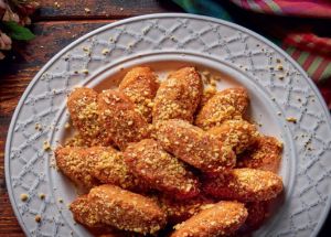 - Αλέθουμε στον πολυκόφτη όλα τα υλικά και πασπαλίζουμε με το μείγμα τα μελομακάρονα στην επιφάνεια.
