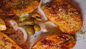 Λιτός και περιεκτικός μεζές, από τους ωραίους. Αν θέλουμε, σερβίρουμε την οφτή πατάτα μαζί με ελιές, ξερό κρεμμύδι χοντροκομμένο και λεμόνι.