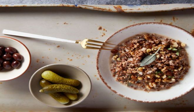 - Πασπαλίζουμε με την υπόλοιπη καρυδόψιχα και συνοδεύουμε με τουρσιά της αρεσκείας μας, ραπανάκια και ελιές.