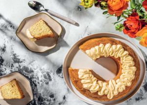 - Αφήνουμε να κρυώσει και γαρνίρουμε με την κρέμα ζαχαροπλαστικής, χρησιμοποιώντας ένα κορνέ.