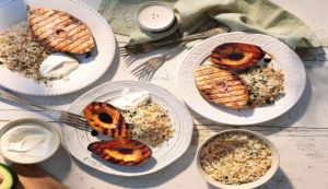 - Αλείφουμε τα αβοκάντο με τη μισή σάλτσα και τα τοποθετούμε στη σχάρα με την κομμένη πλευρά προς τα κάτω.