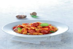 Το παραδοσιακό σπεντζοφάι γίνεται μακαρονάδα στο άψε σβήσε! Προτείνουμε να σερβίρετε τα ριγκατόνι με φύλλα βασιλικού για έξτρα φρεσκάδα.