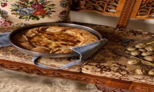 - Φέρνουμε τις άκρες των φύλλων προς τα μέσα και τις στρίβουμε γύρω γύρω στο ταψί, φτιάχνοντας έναν λεπτό κόθρο και αφήνοντας την κρέμα στο κέντρο ανοιχτή.