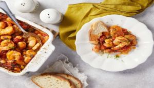 - Ξεφουρνίζουμε για λίγο, τακτοποιούμε τις γαρίδες πάνω στους γίγαντες και ψήνουμε για άλλα 10 λεπτά. Στο τέλος τα φασόλια θα πρέπει να είναι χυλωμένα, αλλά ελαφρά ξεροψημένα από πάνω.