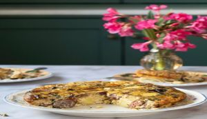 - Αδειάζουμε το μείγμα αυγών στο τηγάνι. Αν το τηγάνι είναι κατάλληλο για φούρνο, το φουρνίζουμε κατευθείαν. Αν όχι, τυλίγουμε το χερούλι του μερικές φορές με αλουμινόχαρτο και το βάζουμε στον φούρνο.
