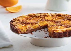 Η φρανζιπάν, η αφράτη ψημένη αμυγδαλένια κρέμα, δένει πολύ όμορφα με τη σοκολάτα και το πορτοκάλι σ’ αυτό το θαυμάσιο γλυκό, που είναι μια πορτοκαλόπιτα σε μορφή τάρτας.