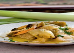 Aπό τη µια η γλύκα του µαγειρεµένου πράσου και του κρεµµυδιού, από την άλλη η πίκρα και ξινάδα από τις ροδέλες λεµονιού που σιγοµαγειρεύονται µε τα υπόλοιπα υλικά.