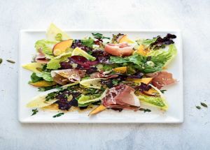 Δεν μπορείτε να φανταστείτε πόσο ταιριάζει το γλυκόξινο ροδάκινο με το πικάντικο νούμπουλο. Μια πεντανόστιμη καλοκαιρινή σαλάτα.