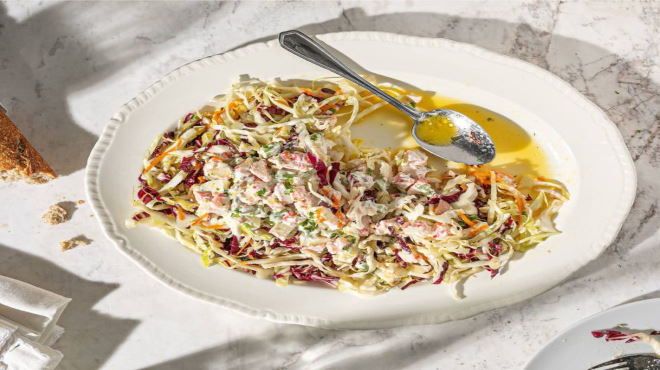 Μια διαφορετική πολίτικη με καβουροσαλάτα (!) που κλέβει τις εντυπώσεις. Με τα μυρώνια, το εστραγκόν και το ντρέσινγκ τριών εσπεριδοειδών γίνεται και απίθανα μυρωδάτη.