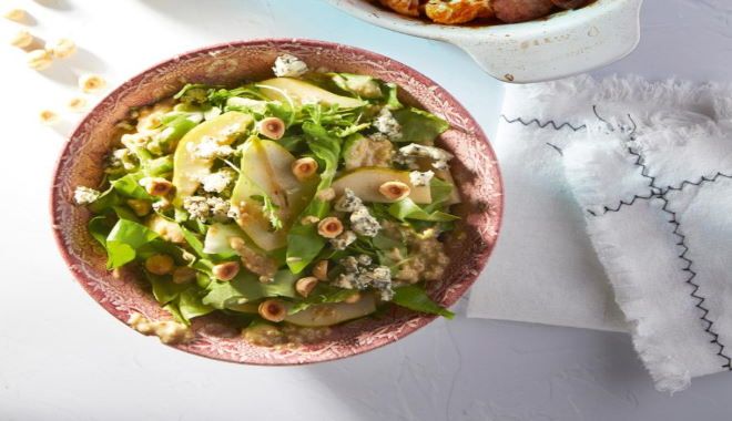Πλούσια σαλάτα με τα φρούτα της εποχής, τα ζουμερά αχλάδια. Ιδανικό τους ταίρι το ροκφόρ με τις εντάσεις του ή κάποιο άλλο μπλε τυρί της αρεσκείας μας, όπως στίλτον, γκοργκοντζόλα κ.ά.