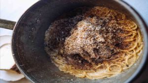 - Μαγειρεύουμε, ανακατεύοντας τακτικά με πιρούνα, μέχρι ο ζωμός σχεδόν να απορροφηθεί από τα ζυμαρικά.