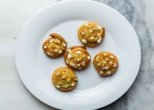 - Σε ελαφρώς αλευρωμένη επιφάνεια πλάθουμε τη ζύμη σε κορδόνι και την ανοίγουμε με τον πλάστη σε μακρόστενο λεπτό φύλλο με διαστάσεις περίπου 35 x 5 εκ. Το λαδώνουμε και αδειάζουμε τη γέμιση κατά μήκος της άκρης της μακριάς πλευράς του φύλλου. Έπειτα τυλίγουμε το φύλλο σε μακρύ ρολό-φλογέρα, καλύπτοντας τη γέμιση. Βρέχουμε με ελάχιστο νερό τις άκρες για να κολλήσουν, το στρίβουμε σε σαλίγκαρο και το βάζουμε στο ψυγείο για περίπου 1 ώρα, μέχρι να σφίξει. Βάζουμε να ζεσταθεί άφθονο λάδι σε ένα φαρδύ και βαθύ σκεύος, μέχρι να φτάσει τους 160°C (δηλαδή σε φωτιά μέτρια προς δυνατή). Βυθίζουμε προσεκτικά την πίτα στο λάδι και την τηγανίζουμε για λίγα λεπτά, μέχρι να ροδίσει απαλά. Τη στραγγίζουμε σε χαρτί κουζίνας, τη διακοσμούμε με μικρές κουταλιές από γιαούρτι και σκορπίζουμε πάνω της το γλυκό με άνθη λεμονιάς, τη γύρη και το ξύσμα.