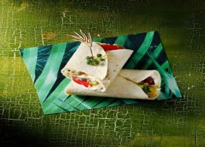 - Τυλίγουμε σφιχτά σε ρολό, στερεώνουμε με δύο οδοντογλυφίδες και κόβουμε τις τορτίγιες λοξά, στη μέση.