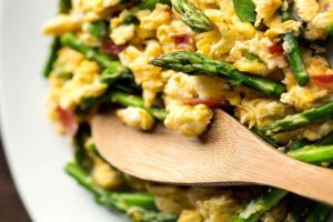 Μπορείτε να βάλετε σπαράγγια πράσινα, μπορείτε να βάλετε και λευκά. Και έτσι και αλλιώς αυτή η στραπατσάδα είναι θαυμάσια. Το μόνο που θέλει είναι μερικές φέτες ωραίο, φρυγανισμένο, ψωμί.