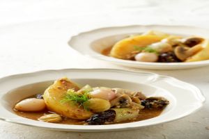 Kάστανα, πράσα, δαμάσκηνα, κρεμμυδάκια του στιφάδου και μανιτάρια με μια ελαφριά σάλτσα που δένει χάρη στα καρύδια της συνταγής. Ό,τι πρέπει για τις κρύες ημέρες!