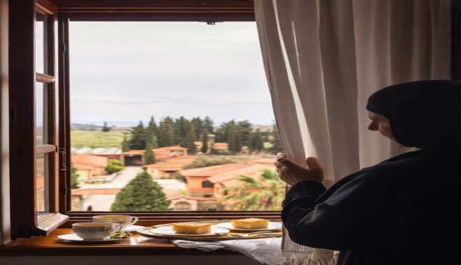 Έίναι από τα πιο ωραία σιροπιαστά γλυκά ταψιού της μονής, με σιμιγδάλι και μαστίχα Χίου. Η ζύμη του πρέπει να είναι μαλακή. Έτσι, το σιμιγδάλι φουσκώνει, γίνεται πιο αφράτο και απορροφά καλά το σιρόπι, επομένως τα κομμάτια αποκτούν καλή δομή και στέκονται, δεν χαλάνε στο κόψιμο.