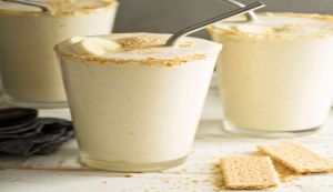- Αδειάζουμε σε ποτήρια, σκορπίζουμε, αν θέλουμε, λίγο θρυμματισμένο μπισκότο και σερβίρουμε.