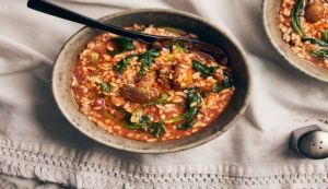 Ένα σπανακόρυζο διαφορετικό από τα κλασικά. Είναι κοκκινιστό και γίνεται πιο χορταστικό με την προσθήκη μανιταριών.