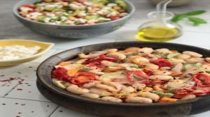 - Ρίχνουμε τα λαχανικά με τα υγρά τους πάνω στα φασόλια και προσθέτουμε τόσο από το υπόλοιπο νερό από το βράσιμο των φασολιών ώστε να σκεπάσει τα υλικά.