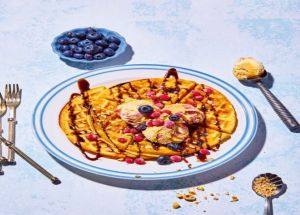 - Σερβίρουμε τις βάφλες με παγωτό, φρούτα της αρεσκείας μας και σιρόπι σοκολάτας.