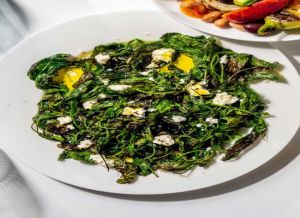 Η αντίθεση της πιπεράτης γεύσης του τυριού με τη γλύκα των ψητών βλίτων είναι εξόχως απολαυστική.