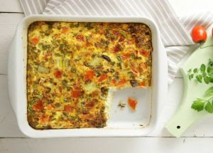 - Αδειάζουμε το μείγμα των αυγών στο ταψί και ψήνουμε περίπου 20 λεπτά, μέχρι να δέσει το μείγμα, να ροδίσει η ομελέτα, αλλά να γίνει και από κάτω (ελέγχουμε ανασηκώνοντάς τη με μια σπάτουλα).