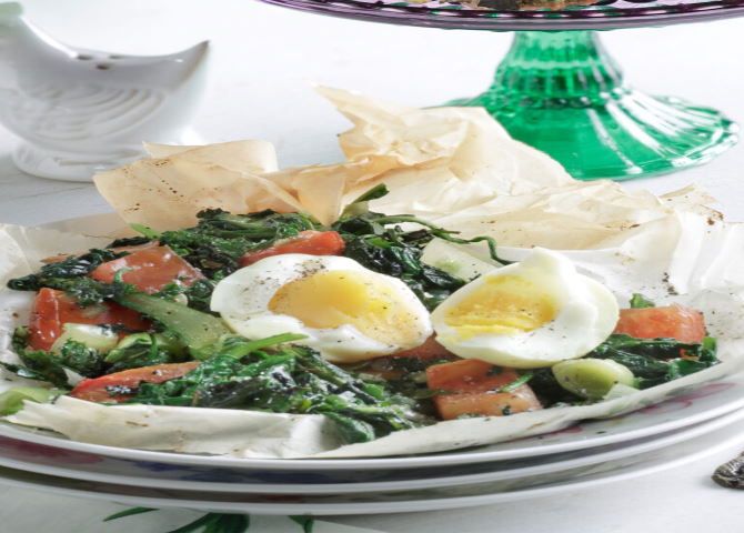 Χόρτα και σπαράγγια που ξεκινάνε στην κατσαρόλα, τελειώνουν στον φούρνο, κλεισμένα σε πακετάκια με ντοματίνια κι αυγά, κι αποκτούν αίσθηση ψητού.
