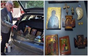 Ο 73χρονος ο οποίος είναι και συνταξιούχος κινηματογραφιστής κατείχε παρανόμως 48 ιερά κειμήλια, μεταξύ των οποίων ήταν ένα φαιλόνιο, ένα πετραχήλι, η ράβδος του βασιλέα Γεωργίου του Β, όπως επίσης πολλές βυζαντινές εικόνες και αρκετά νομίσματα.