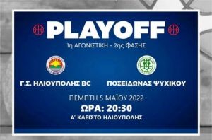 Για την 1η αγωνιστική της 2ης φάσης των Playoff η ομάδα του Γ.Σ.ΗΛΙΟΥΠΟΛΗΣ χθες Πέμπτη (05.05.2022) αντιμετώπισε τον ΠΟΣΕΙΔΩΝΑ ΨΥΧΙΚΟΥ εντός έδρας.