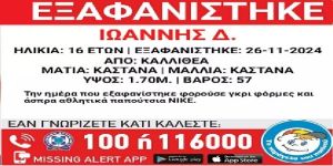 Την εξαφάνιση του Ιωάννη Δ., 16 ετών από την Καλλιθέα γνωστοποίησε με ανακοίνωσή του το «Χαμόγελο του Παιδιού». Τα ίχνη του ανήλικου αγοριού χάθηκαν την Τρίτη (26.11.2024), πρωινές ώρες.