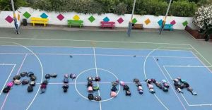 Συμμαθητές της Αγγελίνας σχημάτισαν με τις τσάντες τους στο προαύλιο του σχολείου το όνομα της 7χρονης, που σκοτώθηκε όταν πέρασε μέσα από τζαμαρία στο διαμέρισμα των νονών της στην Καλλιθέα.